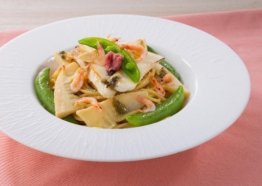春の恵みをたっぷり詰め込んだ贅沢な一皿です。ふき味噌で味付けた和風のスパゲッティに、鯛、桜えび、シャキシャキ食感のたけのこ、スナックエンドウを添えました。桜の塩漬けがアクセントとなり、口の中いっぱいに春の香りが広がります。