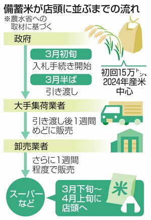 政府が備蓄米放出の概要を発表した2月14日、新潟県内では消費者らからコメの値下げや安定供給を期待する声が聞かれた。備蓄米は3月下旬以降、店頭に並ぶ見通しで、生産者も価格高騰による「コメ離れ」の回避を望む。一方で集荷・卸業者の中には、市場を落ち着かせる効果は限定的との見方があり、安価な外国産米の輸入を検討している業者もいる。