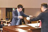 優秀企業賞の表彰状を持つホリカフーズの五十嵐一也社長(左)と星正弘専務=魚沼市堀之内