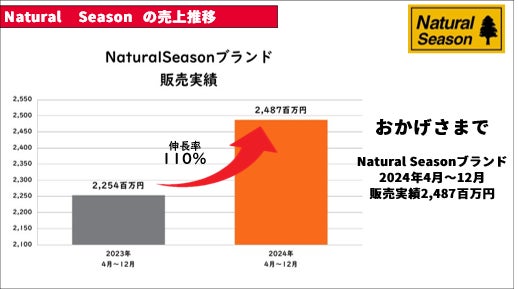 Natural Seasonの売上は好調に推移「Natural Season」は2002年より設立したブランドで、今年で23年目を迎えます。総アイテム数は300アイテムを超え、キャンプ、バーベキュー等、幅広い商品を販売しております。昨年はブランドコンセプトを「自然は、すぐそこにある。」と改め、新たなCMを公開いたしました。皆様に大変ご愛顧いただき、Natural Seasonの売上(2024年4月~12月)は、前年同期比約110%と伸長させていただいております。