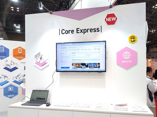 弊社紹介ブースではクラウド型PMS「Core Cast」、スマートフォンから宿泊施設の情報を閲覧可能にするスマホソリューション「Core Guide」、海外ローカルOTAへの掲載をサポート、訪日観光客の集客を支援する新サービス「Core Express」といった製品を展示しました。