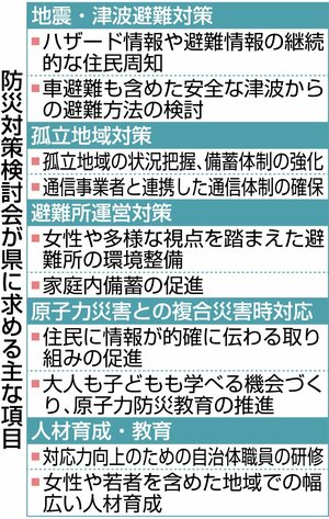能登半島地震の災害対応を踏まえた課題を有識者で検証する新潟県の「防災対策検討会」は2月18日、報告書をまとめた。地震を教訓に住民への避難情報の適切な周知や備蓄体制の強化、避難所運営の改善などを求めた。自然災害と原発事故が重なる複合災害の対応としては、的確な情報伝達や原子力防災に関する教育を推進することを盛り込んだ。