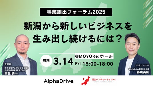 AlphaDrive゙新潟では拠点開設を機に、皆様と協力しながら新潟での事業創出支援を加速して参ります。この最初の一歩として、新潟ベンチャーキャピタル株式会社と共催で下記のイベントを実施いたします。