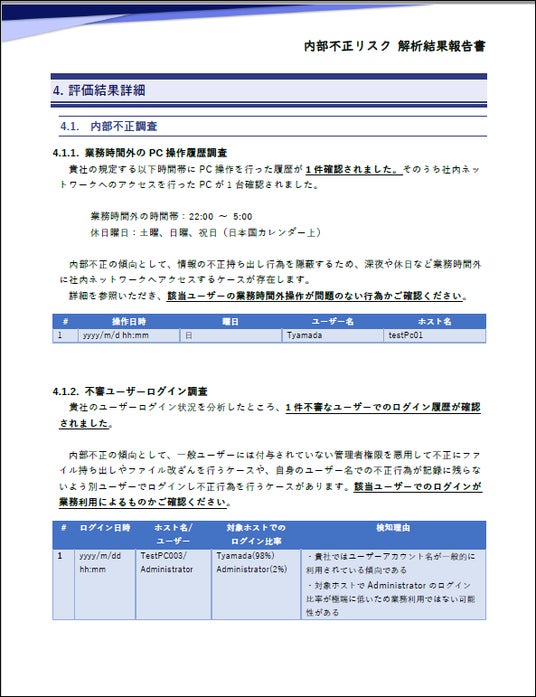 今回提供を開始する「内部不正リスクレポート」では、「MylogStar」のログ収集力を活かしたサービスとして、企業内で収集されたログを分析することで『データ持ち出し』をはじめとしたリスク調査が1回10万円~(調査項目により変動)で可能になります。