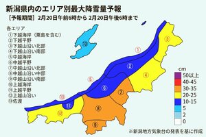 新潟県内は2月19日、冬型の気圧配置が続き、上、中越の山沿いを中心に雪が降り続いた。20日も山沿いで大雪となる所があり、新潟地方気象台は交通障害や吹雪による視界不良、路面凍結などに注意を呼びかけている。