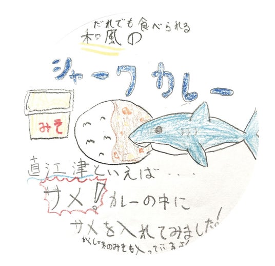 新潟県上越市立直江津小学校からも児童が考えたカレーのアイデアがたくさん届き、そこから1つに絞り、「シャークカレー」に決定しました。
