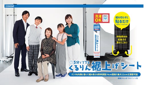 「くるりん裾上げパンツ」に続き、市販パンツを自宅で簡単に裾上げ、長さ調節ができる特許取得商品「くるりん裾上げシート」を発売した。