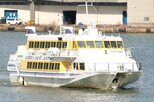 水生生物と衝突したとみられるジェットフォイル「つばさ」=2月21日、新潟市中央区の佐渡汽船新潟港ターミナル(新潟日報社ヘリから)