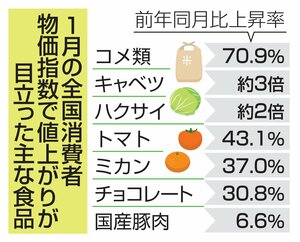 社会 [1月消費者物価指数]コメ伸び率70%で過去最大、キャベツは3倍…歴史的物価高、日銀利上げに影響も 2025/2/22 10:30 (最終更新: 2025/2/22 10:38) 総務省が2月21日発表した1月の全国消費者物価指数で、コメ類が前年同月比70・9%急騰し、4カ月連続で過去最大の伸び率を更新した。生鮮食品は2004年以来、約20年ぶりの高水準となり、キャベツは約3倍だ。生鮮食品を... 残り780文字(全文:887文字) ここから先を読むには 続きを読む(会員登録する) 続きを読む(ログイン) 新潟日報朝刊を購読していますか? はい いいえ トップページで最新情報を見る 関連ニュース 作文コンクール国税庁長官賞受賞 新潟市・横越中学校3年の中村... 9:00 長岡市物価高対策、1万円商品券は4月中旬から10月20日まで... 7:00 長岡市、「文化財保存活用地域計画」案への意見公募 1月29日まで 6:00 プルデンシャル生命保険に金融庁が立ち入りへ 新潟県警は202... 1/27 [新潟県の天気・気象情報]29日からまた大雪か、平地も要注意... 1/27 地域経済を発展、飛躍の年に!見附商工会が新春企業交流会 「地... 1/27 [最高裁判所裁判官 国民審査]判事2人が対象、期日前投票は2... 1/27 覚醒剤を譲り渡した疑い、江南署が栃木県の男逮捕 別事件の捜査で浮上 1/27 ユネスコ登録、風力発電…村上市がより活性化する2026年に!... 1/27 [大学入試]新潟県立大・一般選抜A日程の倍率が発表、国際経済... 1/27 県が主導する上越医療圏再編、全体像の早期提示を 3市長、花角... 1/27 三条市北新保1で車庫を焼く火災、89歳男性が顔に軽いやけど 1/27