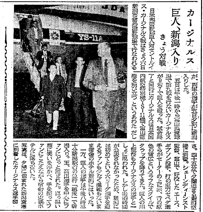 セントルイス・カージナルスを招いて行われた第10戦、対戦したのは巨人だ。選手たちの新潟入りの記事が当時の新潟日報に掲載されている。