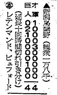 関本自身はこんなことを話しているが、メジャーの常勝軍団の「勝利への執念」を引き出したのは、関本のピッチングもあったのではないだろうか。川上監督のコメントは「3点本塁打されたが、あの場面でタマが真ん中にいくようではどうにもならん」と手厳しい…。ただ、巨人は結果的に引き分けにまで結び付けている。ON(王、長嶋)もそろい、延長十回までの接戦。時間切れの決着に観客からはため息も想像できそうだが、満足もしたことだろう。