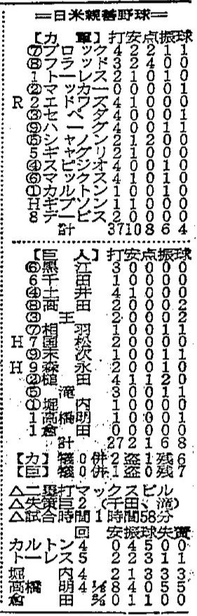 巨人の先発は名投手・堀内恒夫。長嶋(島)茂雄が不在とはいえ、V9時代ど真ん中の打線だ。対するカージナルスは、この年サイ・ヤング賞でMVPの投手ボブ・ギブソンは顔見せで打席に立っただけだが、先発のカールトンも、のちにサイ・ヤング賞を4回獲得する投手。打線には前年MVPの主砲セペダがいる。セペダは抑えたが、本塁打攻勢で一方な展開に。新潟のファンは大いにメジャーのパワーを感じたことだろう。