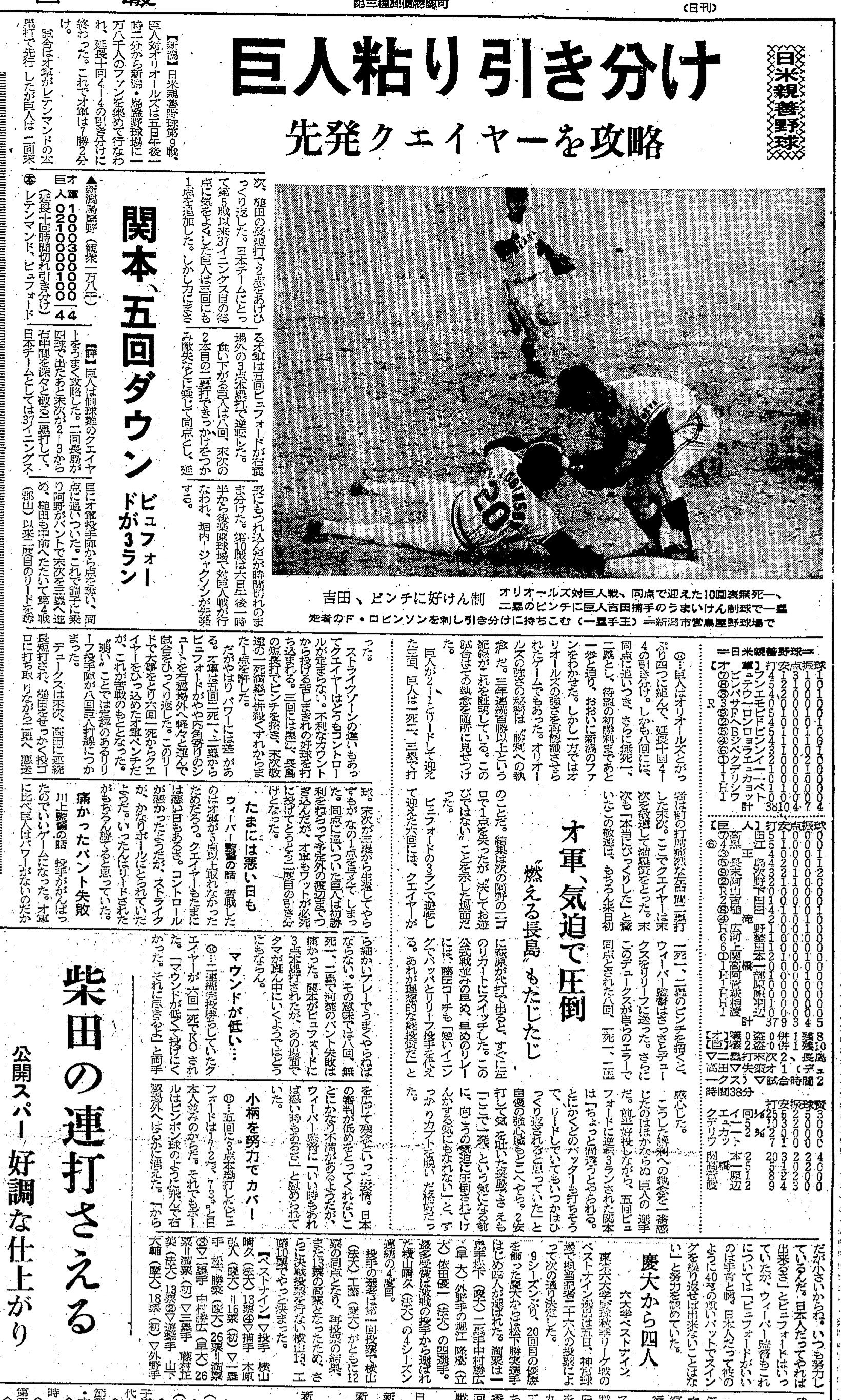 第9戦を午後1時から富山県営球場で戦った両軍だが、その日の夕方には新潟入り。記事によれば、カージナルスの一団と巨人の川上哲治監督は特別機の「YS-11」で富山空港から新潟空港に移動。ぜいたくな空路だ。一方の巨人の選手は急行「越後」で新潟駅に到着した。王貞治という、この年49本塁打、打率3割2分6厘の2冠に輝いたスター選手でさえ異なる移動方法が、メジャーリーガーの特別さを物語っているのかもしれない。