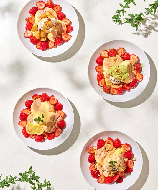 ※写真上から時計回りに「奇跡のパンケーキ アップルシナモン」「奇跡のパンケーキ 宇治抹茶とクッキー&クリーム」「奇跡のパンケーキ ロイヤルミルクティー」「奇跡のパンケーキ 3種のレモンとレアチーズ」