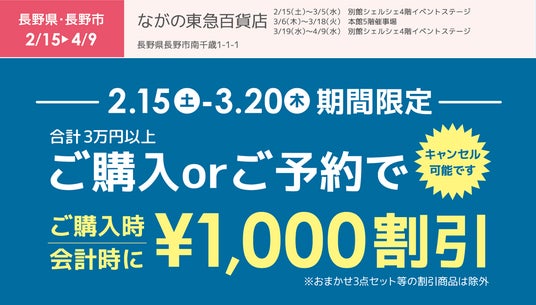 2月15日から3月20日の間、合計3万円以上のご購入またはご予約で、商品合計から1,000円OFFの特別キャンペーンを実施。お得に買える期間限定のキャンペーンですので、お見逃しなく。ご予約は、キャンセル可能です。