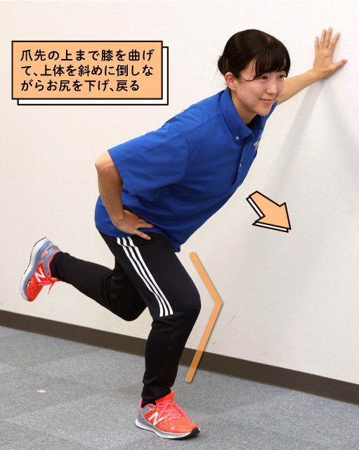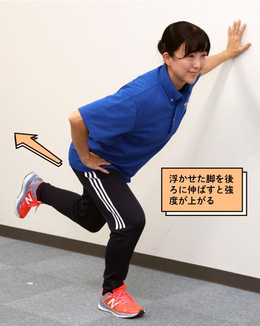 (2)爪先の上まで膝を曲げて、上体を斜めに倒しながらお尻を下げ、戻る。10〜20回を目安に繰り返す。反対側の脚も同様に行う。浮かせた脚を後ろに伸ばすと強度が上がる。