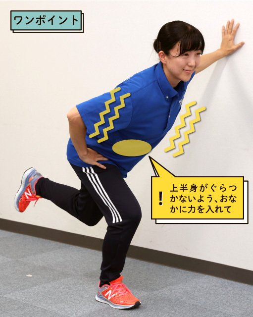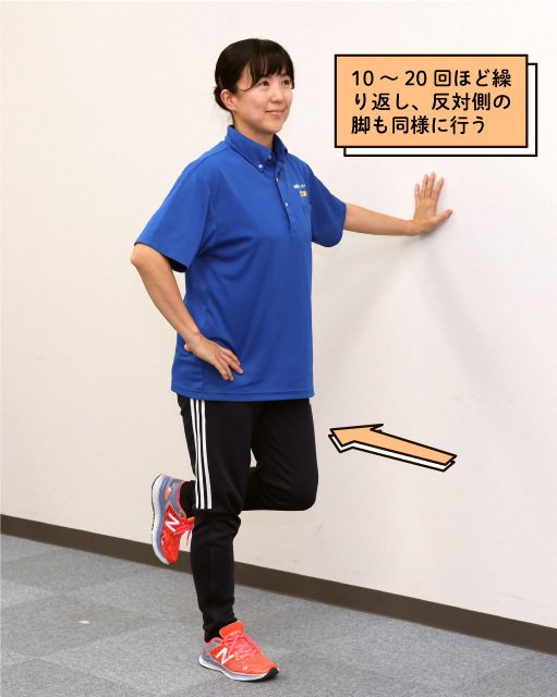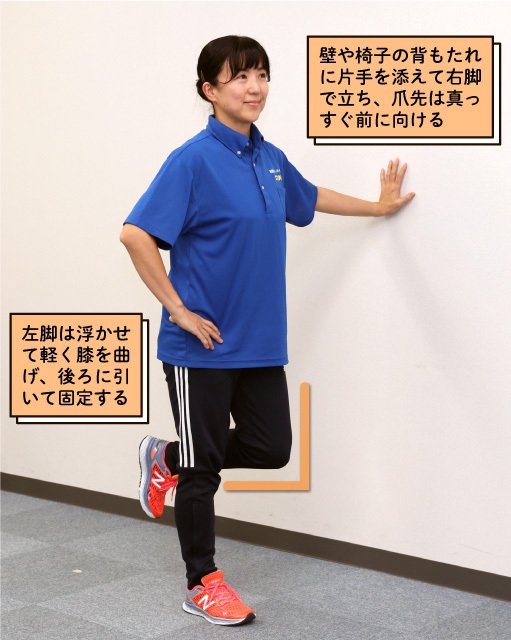 (1)壁や椅子の背もたれに片手を添えて右脚で立ち、爪先は真っすぐ前に向ける。左脚は浮かせて軽く膝を曲げ、後ろに引いて固定する。