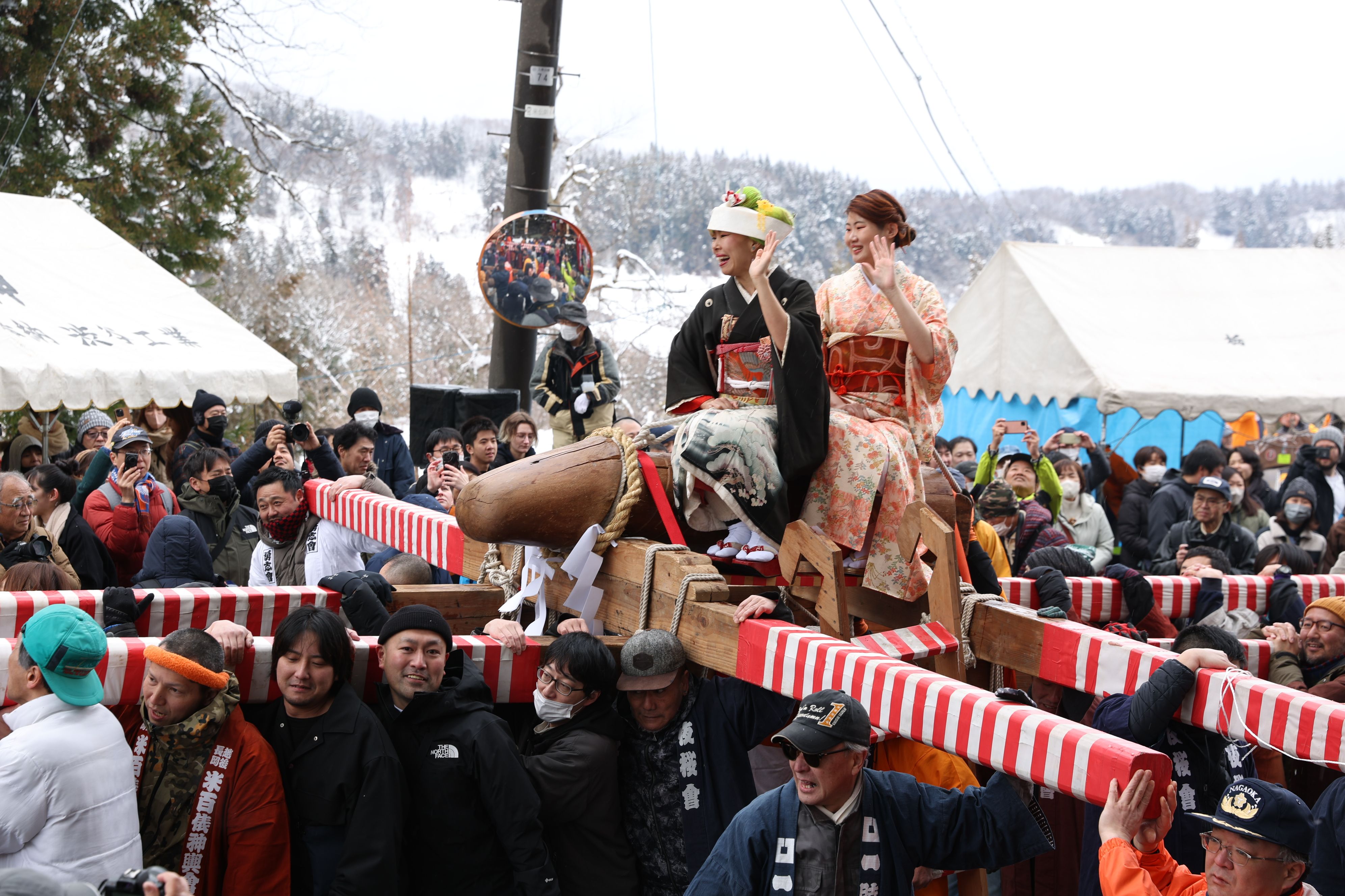 男根の形をしたご神体「ほだれ様」のみこしに新婚の女性が乗り、子宝や安産、五穀豊穣を願う。