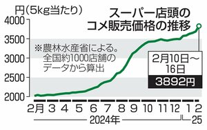 経済 米・農業 コメ5キロ4000円に迫る!2024年比1・9倍、備蓄米放出発表後も高騰続く 入札の反応が焦点 2025/3/3 19:00 コメの平均価格が5キロ当たり4千円に迫る勢いだ。2024年比1・9倍と高騰している。政府は約2週間前、値下がりを狙い最大21万トンの備蓄米を放出すると発表したが、業者間の取引に大きな変化が見られず、店頭価格も... 残り781文字(全文:886文字) ここから先を読むには 続きを読む(会員登録する) 続きを読む(ログイン) 新潟日報朝刊を購読していますか? はい いいえ トップページで最新情報を見る 関連ニュース [1月消費者物価指数]コメ伸び率70%で過去最大、キャベツは... 2025/2/22 1月のコメ相対取引価格2万5927円、単月で過去最高値…コメ... 2025/2/19 [備蓄米放出発表]コメの値下げ、流通量の増加に消費者ら期待…... 2025/2/15 政府備蓄米、最大21万トンを3月下旬から店頭へ 江藤拓農林水... 2025/2/14 【独自】期待のコメ新品種「なつほなみ」新潟県が名称変更を検討... 5:00 野菜・果物の販売額向上へ一丸 新潟市で県園芸振興大会、高温対... 1/26 柏崎市で県産ブランドイチゴ「越後姫」出荷始まる 真っ赤でジュ... 1/25 猛暑にも負けず◎ JA新潟かがやきのコシ「食味コンテスト」、... 1/19 収量3割増「しきゆたか」“超多収”で販路拡大中!市場ニーズに... 1/19 暑さに強い極早生品種「なつほなみ」は県産米の“けん引役”とな... 1/16 2026年は米騒動落ち着かせたい…県農協中央会会長・伊藤能徳... 1/16 天候と向き合う難しさ学び…盆花栽培にも挑戦!独立2年目の若手... 1/15