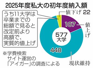 社会 私立大学の2割が初年度納入額を値上げ…2025年度、家計の負担増鮮明に・民間企業調査 2025/3/10 8:00 全国の私立大学577校のうち、入学金や授業料などを合わせた初年度納入額を2025年度に値上げするのは、約2割に当たる107校に上ることが、民間企業の調査で分かった。物価高などが要因とみられ、家計の学費... 残り477文字(全文:578文字) ここから先を読むには 続きを読む(会員登録する) 続きを読む(ログイン) 新潟日報朝刊を購読していますか? はい いいえ トップページで最新情報を見る 関連ニュース 燕市の工場敷地内の地下水から基準値超の鉛検出、健康被害確認さ... 20:15 特殊詐欺の「かけ子」に勧誘か、男逮捕 「行き先はラオス」など... 19:15 糸魚川のナメコからセシウム検出、基準値は下回る 18:50 児童ポルノ製造容疑で新潟市中央区の男を逮捕、10代女性に裸の... 18:45 盗品と知りながら銅線買い取りか…ベトナム国籍の男を逮捕、新発... 18:10 新潟市西区の飲食店で火災、調理場から出火し壁焦がす 店主の男... 17:45 [不審者情報]新潟市中央区で児童らに握手を求め「家に寄ってい... 14:40 [クマ目撃情報]村上市、新発田市、阿賀町、長岡市、見附市、魚... 14:10 見附市の大平森林公園でクマ目撃…8日まで終日閉園に、9月下旬... 12:45 [戦後80年]直江津捕虜収容所跡の平和記念公園(上越市)開園... 11:45 おいしい記憶を伝えたい…キッコーマンの大津山厚さん出前授業 ... 8:00 県民の安全安心に全力、長年の労ねぎらう 県警が元警察官に勲章伝達 6:00