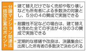 社会 築40年超が137万戸…老朽マンション再生へ、多数決で売却・取り壊し 政府が関連法一括改正案を閣議決定 2025/3/15 12:30 政府は3月4日、分譲マンション関連法の一括改正案を閣議決定した。建て替えだけでなく、売却や取り壊しなども所有者による多数決の対象とし、5分の4の賛成で実行できるよう要件を緩和する。老朽化した物件は増え... 残り839文字(全文:940文字) ここから先を読むには 続きを読む(会員登録する) 続きを読む(ログイン) 新潟日報朝刊を購読していますか? はい いいえ トップページで最新情報を見る 関連ニュース 全国の市街地再開発に公費1兆円超、タワマン乱立で問われる公共... 2024/11/18 分譲マンションの修繕積立金、増額幅は「新築時の1・8倍まで」... 2024/3/31 分譲マンションの修繕積立金増額幅に上限、「基準額」の1・1倍... 2024/2/26 貴重な資料を未来へどう残す?マイクロフィルム生産終了へ、県立... 11/6 燕市の工場敷地内の地下水から基準値超の鉛検出、健康被害確認さ... 11/6 特殊詐欺の「かけ子」に勧誘か、男逮捕 「行き先はラオス」など... 11/6 糸魚川のナメコからセシウム検出、基準値は下回る 11/6 児童ポルノ製造容疑で新潟市中央区の男を逮捕、10代女性に裸の... 11/6 盗品と知りながら銅線買い取りか…ベトナム国籍の男を逮捕、新発... 11/6 新潟市西区の飲食店で火災、調理場から出火し壁焦がす 店主の男... 11/6 [不審者情報]新潟市中央区で児童らに握手を求め「家に寄ってい... 11/6 [クマ目撃情報]村上市、新発田市、阿賀町、長岡市、見附市、魚... 11/6