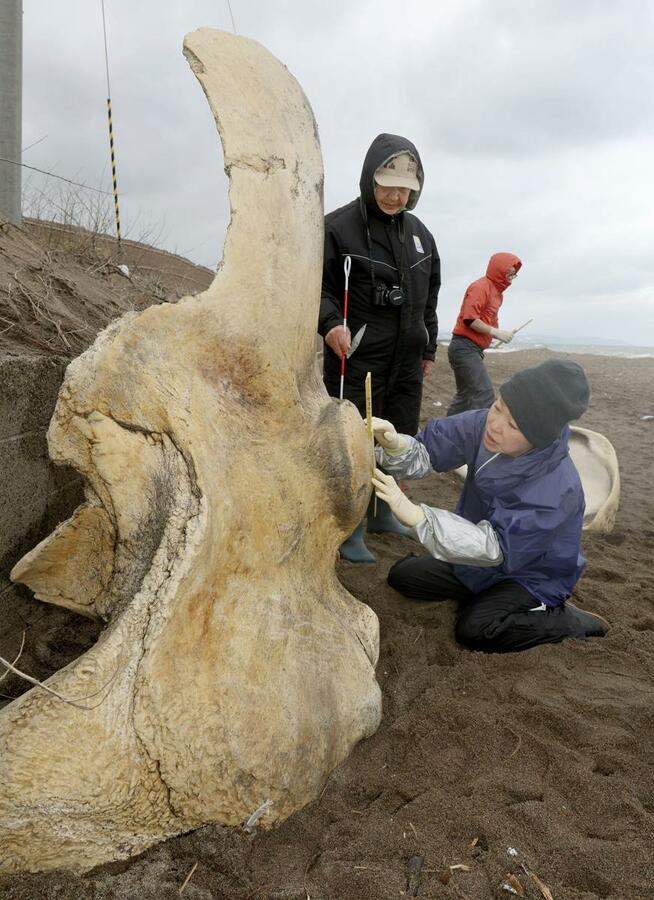 骨は2月1日に市民が打ち上げられているのを発見し、県上越地域振興局に連絡した。同局から調査依頼を受けた関谷伸一・県立看護大名誉教授(74)=解剖学=が調べたところ、クジラの後頭骨と肋骨、胸骨と推定。クジラのものとみられる筋肉などの軟体組織や、上顎骨、下顎骨の一部も見つかった。