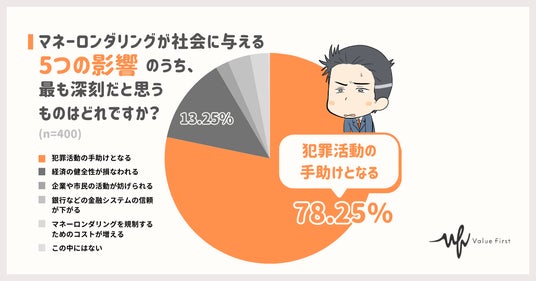 アンケートの結果、マネーロンダリングが与える最も深刻な影響として、回答者の78.25%が「犯罪活動の手助けとなる」と回答。