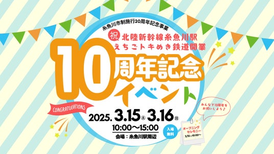 観光地域づくり法人(DMO)一般社団法人糸魚川市観光協会(代表理事 龍見和弦)は、新潟県糸魚川市制施行20周年及び、北陸新幹線糸魚川駅、えちごトキめき鉄道の開業10周年を記念して、2025年3月15日(土)、16日(日)に糸魚川駅周辺において記念イベントを開催します。