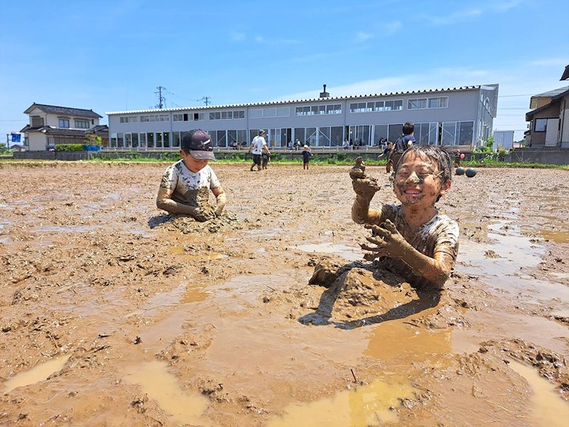 飯塚さんが運営する複合型商業施設「ハコニワ」(柏崎市)裏には田んぼが。田植えより、泥遊びに夢中