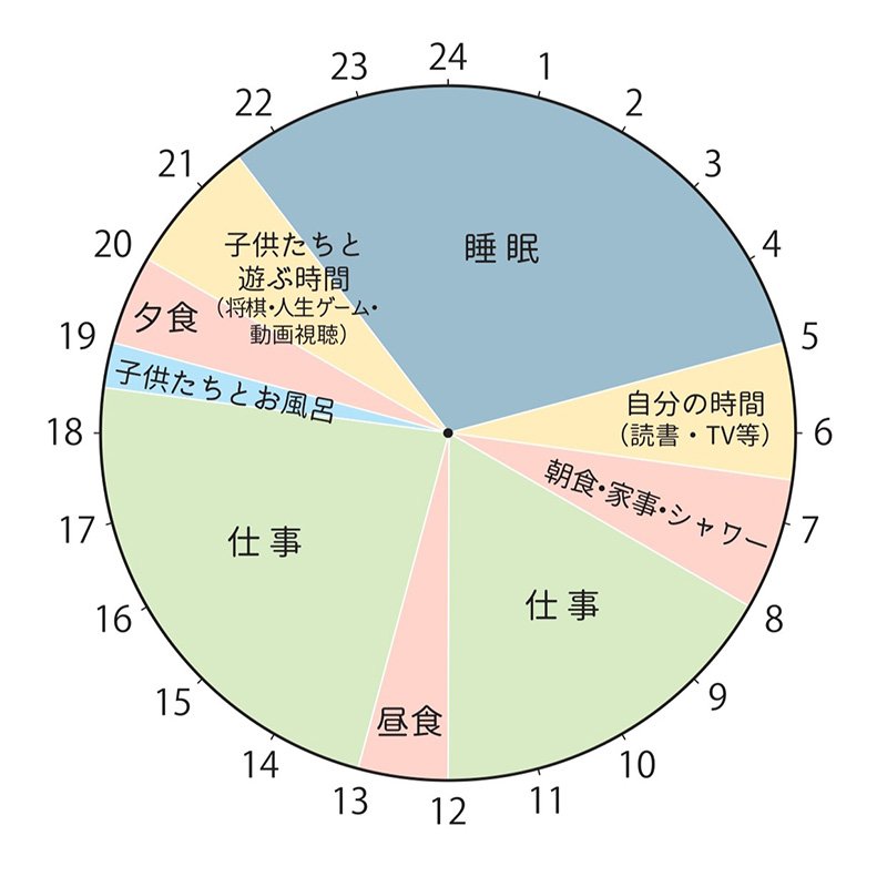 子どもたちが起きてくる前に起床して自分の時間を過ごす飯塚さん。昼間は仕事をし、帰宅ししたら子どもたちとお風呂に入る。夕食後は親子で遊ぶ時間。将棋やボードゲームなど、3人のお子さんとやりたい遊びを一緒に楽しんだら21時半ごろに就寝。休日は子どもたちを連れて外へ遊びに行くことが多いという。