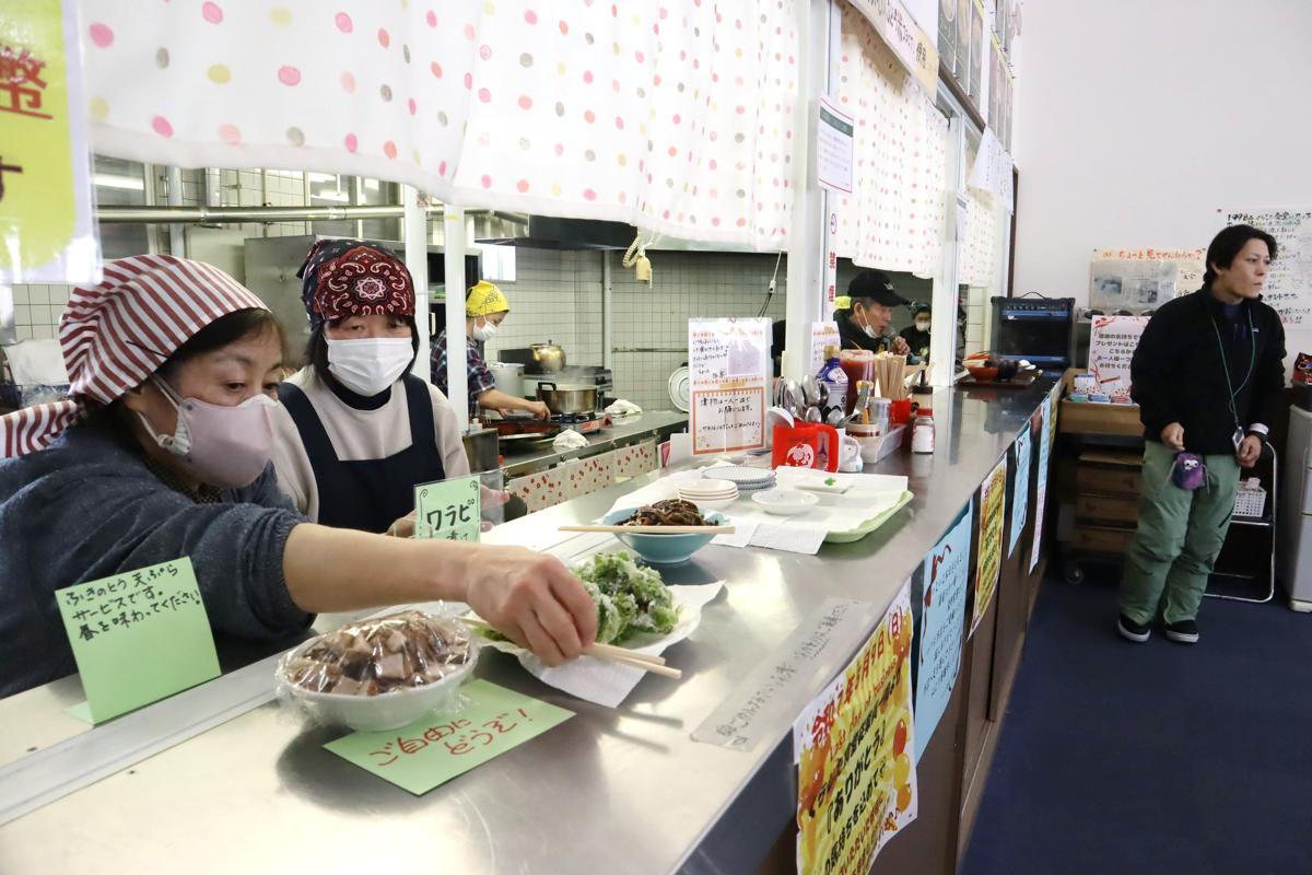 くらした食堂を訪れる人のお目当ては、地元で作られ、無料提供された赤カブ漬け。一緒に並べられたふきのとうの天ぷら、ワラビ漬けも合わせて、あっという間になくなった。