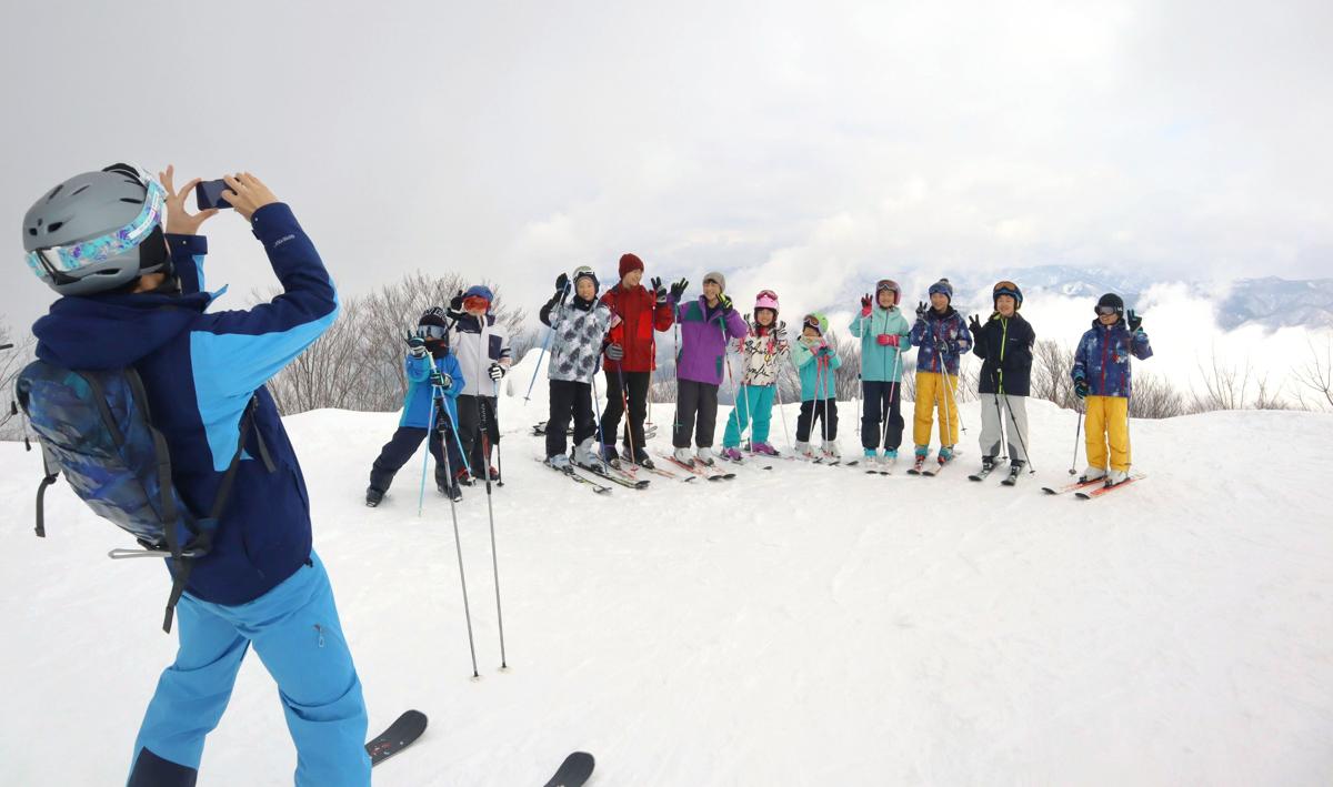 チームは山頂に到着すると、朝日連峰の山並みを背景に記念撮影。メンバーの小学5年生(11)も多彩な魅力に気付いた。「雪質も良くて、急だけど滑りやすい。家並みも木もたくさん見えてきれい」