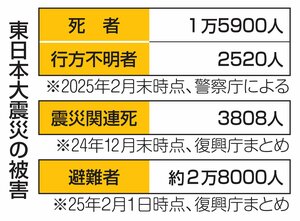 社会 原発 東日本大震災 [東日本大震災14年]まだ2万8千人が避難余儀なく…新潟県内に1700人超 2025/3/11 5:00 東日本大震災は3月11日、発生から14年となった。2011年3月11日午後2時46分、三陸沖を震源とするマグニチュード(M)9・0の地震が発生し、最大震度7を観測。沿岸部を巨大津波が襲った。警察庁によると、... 残り253文字(全文:357文字) ここから先を読むには 続きを読む(会員登録する) 続きを読む(ログイン) 新潟日報朝刊を購読していますか? はい いいえ トップページで最新情報を見る 関連ニュース 47都道府県のコメで造る日本酒「絆舞」、曙酒造(福島県)で仕... 10/11 福島第1原発立地自治体からの避難者815人、いまだ仮設生活 ... 9/1 新潟県が東京電力から福島第1原発事故の損害賠償金3639万円... 7/31 【動画あり】子どもたちが帰ってきた…東日本大震災で3人の子失... 6/30 東電福島原発事故株主訴訟、県内関係者「結論ありき」怒りあらわ... 6/6 13兆円超の巨額賠償から一転「え、うそだろ」 東電株主代表訴... 6/6 新潟県、東京電力から福島第1原発事故の損害賠償金6万円受け取る 5/23 福島の心の復興見届けたい…元復興副大臣・浜田昌良さん、双葉町... 4/14 [福島第1原発事故14年]中間貯蔵施設に廃棄物搬入開始10年... 3/16 東日本大震災から14年、被災地の冥福や復興を祈る 新潟県三条... 3/12 津波で新潟県燕市出身の妻を亡くした宮城県石巻市の遠藤仁雄さん... 3/12 [東日本大震災14年]津波で家族が犠牲に…捜索阻んだ原発事故... 3/11