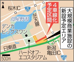 新潟市中央区の鳥屋野潟南部地区の開発を巡り、市が倉庫型商業施設のオープンが予定される周辺道路の4車線化に2025年夏ごろ着工することが3月12日、分かった。施設の開業が28年4月と見込まれることから、27年度内の工事完了を目指す。新潟市議会環境建設常任委員会で市側が説明した。
