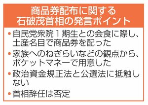 政治・行政 国政 石破茂首相、自民党衆院1期生15人に商品券10万円配布 全員が後日返却 2025/3/14 5:00 石破茂首相が3月3日に公邸で開いた自民党衆院1期生15人との会食に際し、首相事務所が土産名目で1人当たり10万円分の商品券を配っていたことが分かった。複数の出席者らが13日、証言し、首相も事実関係を認めた。総額150万円... 残り1400文字(全文:1511文字) ここから先を読むには 続きを読む(会員登録する) 続きを読む(ログイン) 新潟日報朝刊を購読していますか? はい いいえ トップページで最新情報を見る 関連ニュース 来年1月解散の可能性も…立憲民主・安住幹事長が燕市で語る 柏... 12/6 与党の衆院議員定数削減法案、小選挙区は20都道府県が対象に ... 12/4 自民党の麻生太郎氏、台湾巡る首相答弁に問題なし 斎藤洋明衆院... 12/3 [2024年分 政治資金収支報告書]新潟県内で活動する政党、... 11/28 高市政権「順調なスタート」と鈴木自民党幹事長、新潟市の党会合... 11/25 立憲民主の国会活動、SNSで非難浴びる 「姿勢変えない」一方... 11/24 国民民主・榛葉幹事長が来県 「新潟でも候補擁立」衆院選へ意欲示す 11/22 経済財政諮問会議にDeNA南場智子会長(新潟市出身)ら、民間... 11/10 【政治コラム・永田町天地人】高市政権の行方 鍵握る遠藤首相補... 10/27 高市早苗首相の所信表明、新潟県関係国会議員の評価は…自民党「... 10/24 初の女性首相誕生の意義、影響は?新潟国際情報大・越智敏夫学長... 10/23 【高市内閣発足】新潟県内の経済団体、物価高対策や景気拡大に期... 10/21