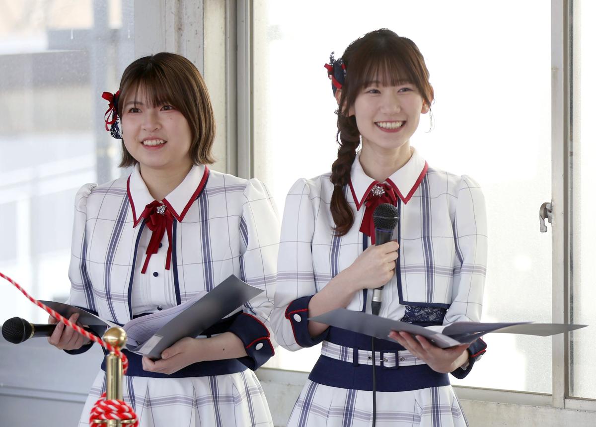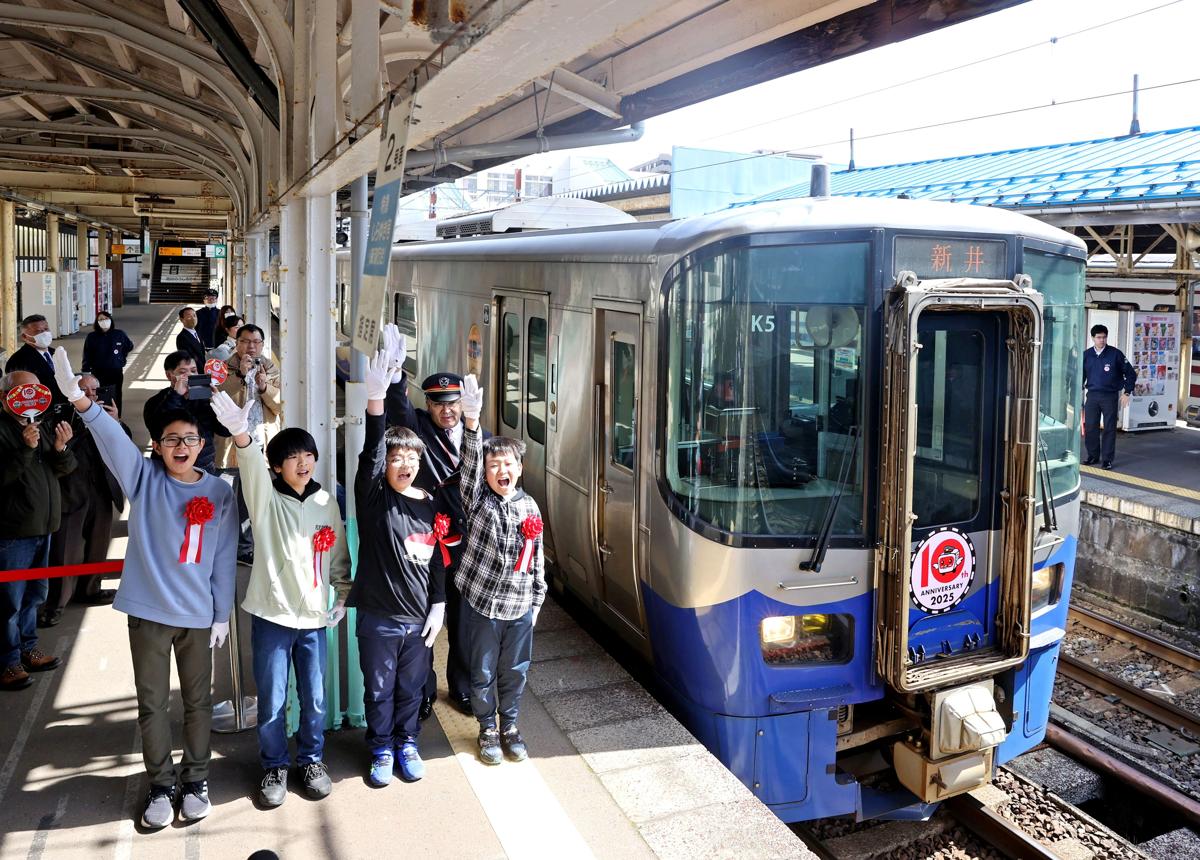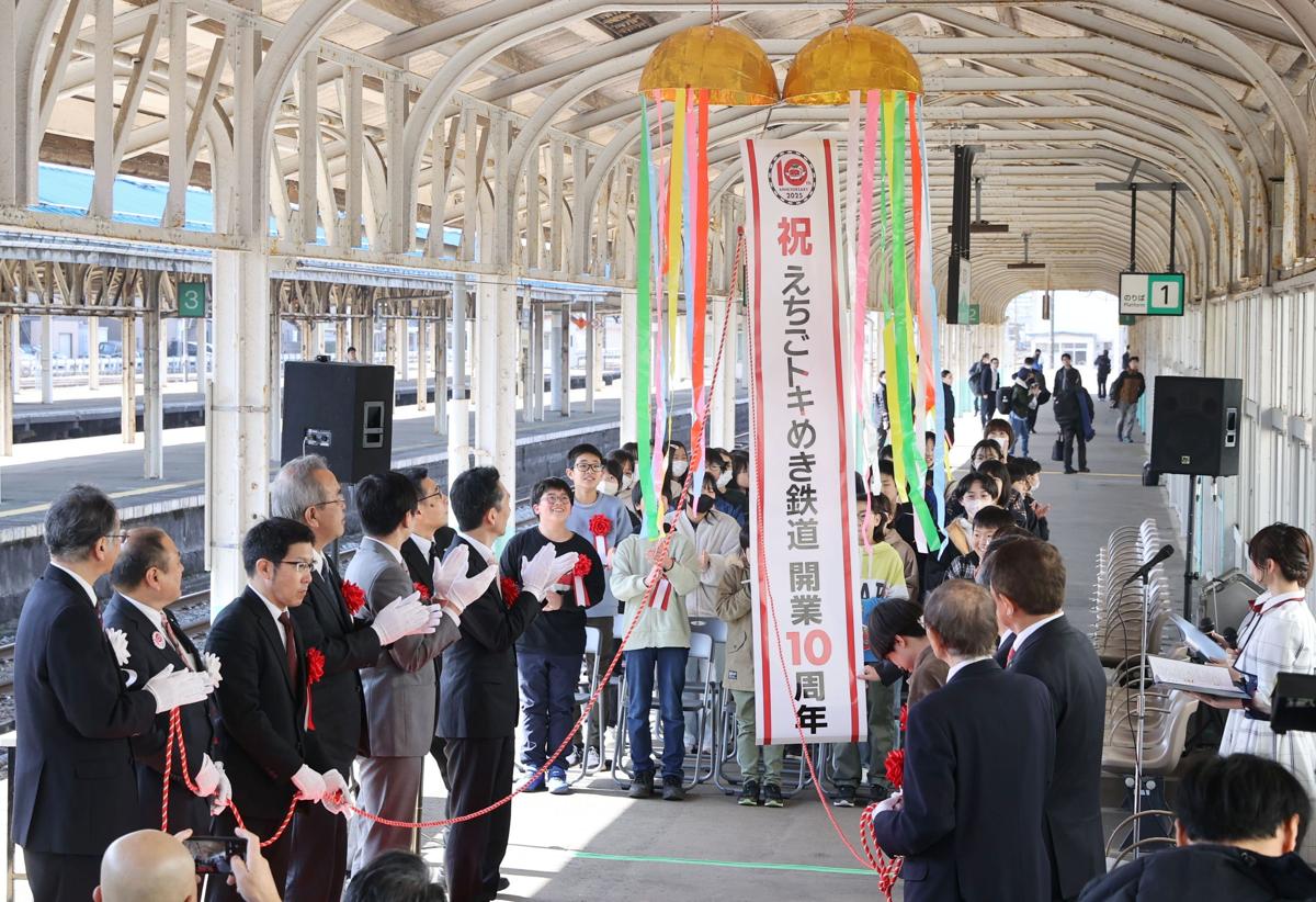 セレモニーはトキ鉄スペシャルアンバサダーでNGT48の佐藤海里さん(24)、三村妃乃(ひの)さん(22)が司会を務め、関係者がくす玉を割った。直江津南小の子どもたちが「発車」と合図すると、開業10周年の記念ロゴをつけた列車が発進した。