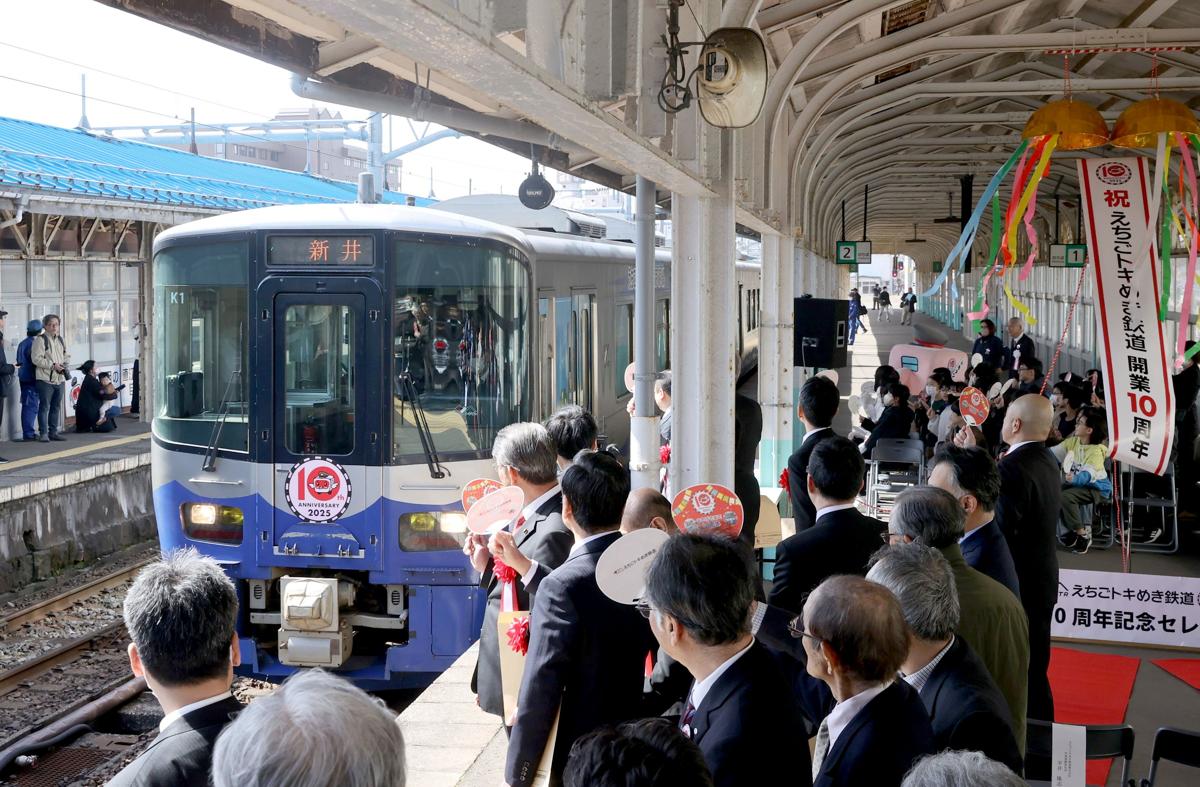 えちごトキめき鉄道(新潟県上越市)は3月14日、開業10年を迎え、記念セレモニーを直江津駅のホームで行った。関係者や地元の小学生らが出発する車両を見送り、節目を祝った。