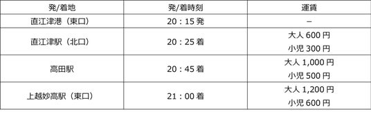 ・直江津港発の片道運行です。直江津駅および高田駅で途中乗車できませんのでご注意ください。