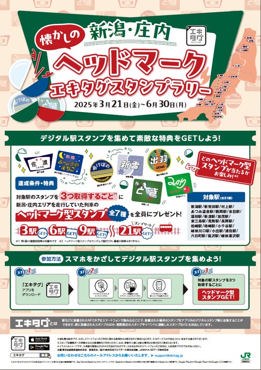 ◎株式会社ジェイアール東日本企画が提供する駅スタンプアプリ「エキタグ」では、2025年3月21日(金)より「新潟・庄内 懐かしのヘッドマークエキタグスタンプラリー」が開催されます!対象駅を巡って「エキタグ」を集めると、新潟・庄内エリアをかつて走行していた懐かしい列車のヘッドマーク型スタンプがもらえます!ぜひこの機会に新潟・庄内エリアへお越しください♪