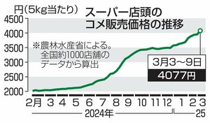 農林水産省は3月17日、3月3〜9日に全国のスーパーで販売されたコメ5キロ当たりの平均価格が、前年同期と比べ99・3%高い4077円だったと発表した。データの集計を始めた2022年3月以降、初めて4千円台を付けた。前週比では125円高く10週連続で値上がりし、コメ価格の高騰が続いた。農水省が入札を実施した政府備蓄米は3月下旬にも店頭に並ぶ見通し。ただ関係者の間では備蓄米放出による値下がり効果は「数百円程度」との見方が多く、前年同期の2千円台に戻るのは難しそうだ。