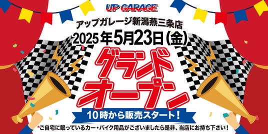 カー&バイク用品のリユース専門店「アップガレージ」を全国展開する株式会社アップガレージグループ(本社:神奈川県横浜市、代表取締役社長:河野映彦)は、2025年5月23日に、フランチャイズ店の「アップガレージ新潟燕三条店」、併設店として「アップガレージライダース新潟燕三条店」「タイヤ流通センターアップガレージ新潟燕三条店」を新規出店いたします。