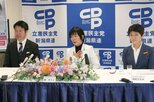 記者会見で決意を述べる立憲民主党の森裕子氏(中央)=新潟市中央区