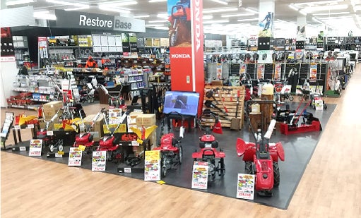 特に力を入れた大型機械売場では、「Honda」の耕うん機やエンジン式芝刈機などの農作業をサポートする作業機械を取り揃えます。また、自店修理を行う「Restore Base」を設置し、お客様の製品をより早く、安心して修理・メンテナンスできる体制を整えました。