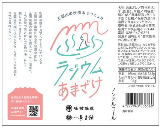 また、阿賀野市として五頭温泉郷やラジウム温泉の認知度向上を図るため、甘酒のラベルには企業広告ではなく、五頭温泉郷組合HPのQRコードを記載しました。今後も県内企業との積極的なコラボレーションを通じて、新潟の魅力を広く発信していきたいと考えております。