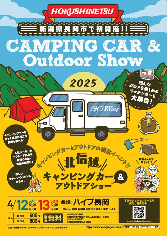 北信越キャンピングカー&アウトドアショー実行委員会(事務局:有限会社カトーモーター、株式会社ブシロードムーブ、株式会社ネオプロジェクト)は、2025年4月12日(土)~4月13日(日)に「北信越キャンピングカー&アウトドアショー2025」を開催することをご報告いたします。