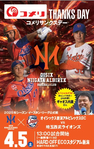2年目のNPBイースタン・リーグ、『勝』利に向けて突き進んでいくチームを今年も「ユニフォームスポンサー」としてともに盛り上げたく、『コメリサンクスデー』を4月5日(土)に企画いたしましたので下記の通りご案内させていただきます。