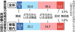 新潟日報社が加盟する日本世論調査会がこのほどまとめた原発に関する全国郵送世論調査の結果によると、東京電力柏崎刈羽原発新潟県の柏崎市、刈羽村にある原子力発電所で、東京電力が運営する。1号機から7号機まで七つの原子炉がある。最も古い1号機は、1985年に営業運転を始めた。総出力は世界最大級の約821万キロワット。発電された電気は関東方面に送られる。2012年3月に6号機が停止してから、全ての原子炉の停止状態が続いている。東電が原発を再稼働させるには、原子力規制委員会の審査を通る必要がある。7号機は2020年に全ての審査に「合格」したが、安全対策を施している最中で、再稼働していない。の再稼働東京電力福島第1原発事故を受け、国は原発の新規制基準をつくり、原子力規制委員会が原発の重大事故対策などを審査する。基準に適合していれば合格証に当たる審査書を決定し、再稼働の条件が整う。法律上の根拠はないが、地元の自治体の同意も再稼働に必要とされる。新潟県、柏崎市、刈羽村は県と立地2市村が「同意」する地元の範囲だとしている。の賛否について、東電管内とほぼ重なる衆議院比例ブロックのエリア(静岡県を除く)でみると、「どちらかといえば」を含めた「反対」が49・4%、「賛成」が48・9%で拮抗(きっこう)した。