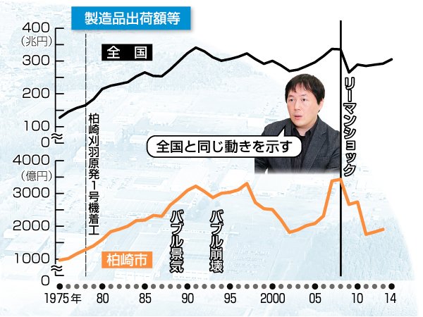 東日本大震災の翌年である2012年、柏崎市の経済規模を示す「市内総生産」が急減した。前年の2割に当たる約781億円が失われた。