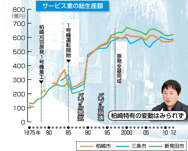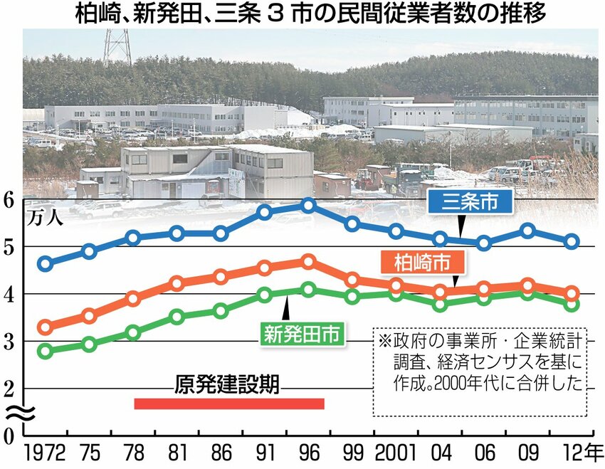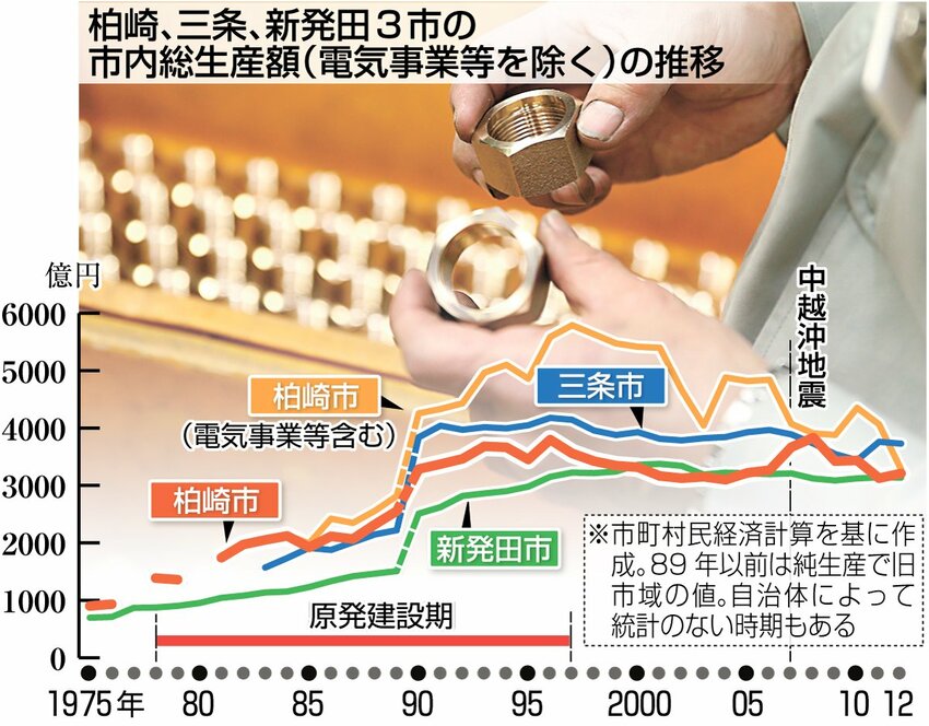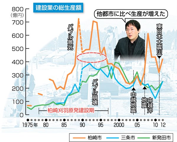 柏崎市の建設業の総生産額は、原発1号機着工の1978年から大きく伸びて、新発田、三条両市の倍以上で推移した。