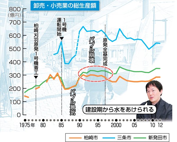 柏崎市の卸売・小売業の総生産額は1990年まで新発田市とほぼ同水準だった。原発の建設が10年以上も続いていたが、新発田を大きく上回ることはなかった。